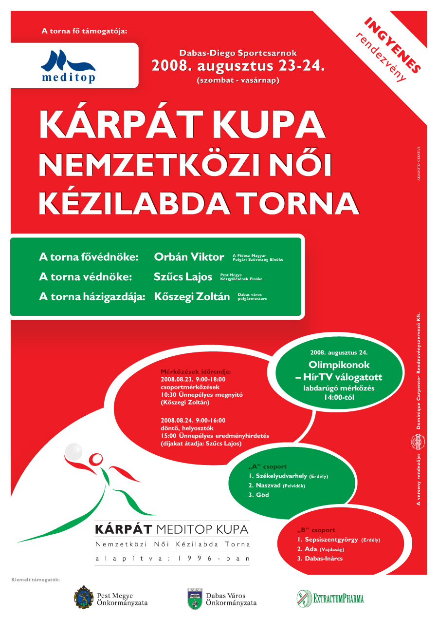2008. augusztus 23–24.-én hazai és határon túl élő magyar csapatok részvételével Dabason megrendezésre került az V. Kárpát Meditop Nemzetközi Női Kézilabda Torna. A kétnapos eseményen komoly küzdelemmel átitatott emlékezetes és színvonalas mérkőzéseket láthattunk, mely igazi megmérettetést jelentett sportolónak és edzőnek. Számos izgalmat hozott a szurkolóknak, több száz nézőnek pedig felhőtlen kikapcsolódást nyújtott. Ám ez a két nap mást is jelentett.