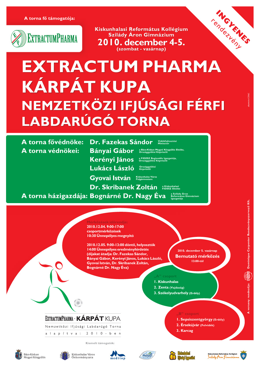 2010. december 4–5.-án hazai és határon túl élő magyar csapatok részvételével Kiskunhalason megrendezésre került az I. Extractum Pharma Kárpát Kupa Nemzetközi Ifjúsági Férfi Labdarúgó Torna. A kétnapos eseményen komoly küzdelemmel átitatott emlékezetes és színvonalas mérkőzéseket láthattunk, mely igazi megmérettetést jelentett sportolónak és edzőnek. Számos izgalmat hozott a szurkolóknak, több száz nézőnek pedig felhőtlen kikapcsolódást nyújtott. Ám ez a két nap mást is jelentett.