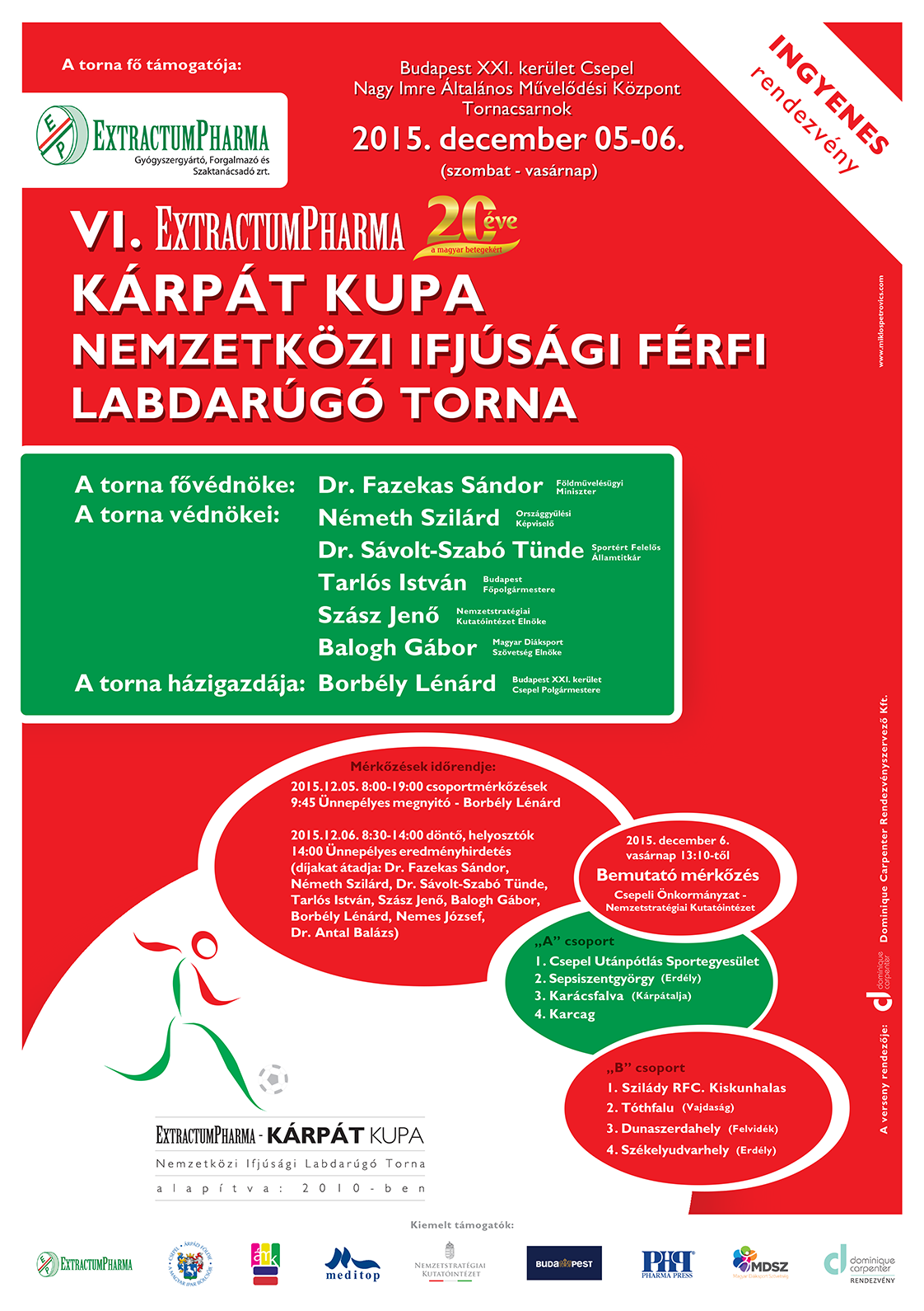 2015. december 5-6-án hazai és határon túl élő magyar csapatok részvételével Csepelen megrendezésre került az VI. Extractum Pharma Kárpát Kupa Nemzetközi Ifjúsági Férfi Labdarúgó Torna.