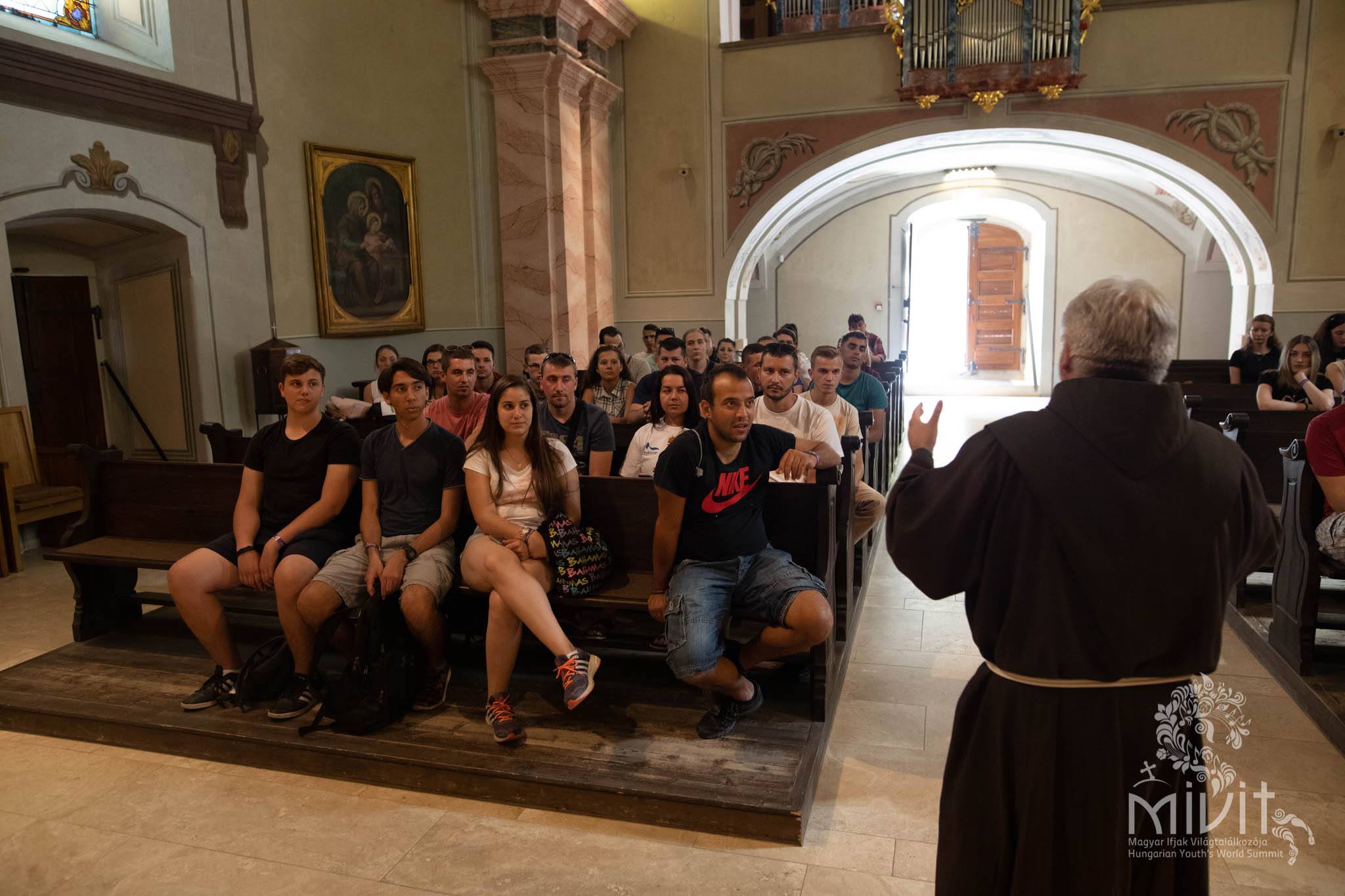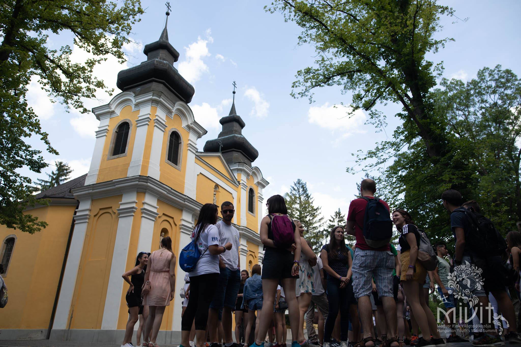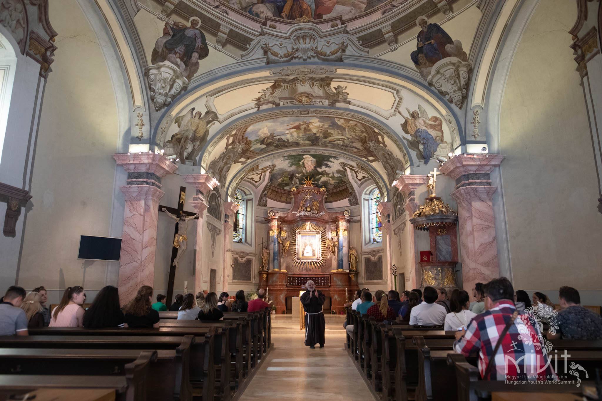 14:00 / Utazás a Mátraverebély-Szentkúti kegyhelyre / A hagyomány szerint 1091–92-ben Szent László király ellenségei elöl menekült, és egy szakadék fölé ért. Innen reménytelen volt a továbbjutás, de lovával ugratott egyet, és ekkor fakadt itt az első forrás. Az első gyógyulás a XIII. században történhetett, amikor a Szűzanya, karján a kis Jézussal, megjelent egy verebélyi néma pásztornak, és azt parancsolta neki, hogy ásson a földbe, és az előtörő vízből igyon. A fiú engedelmeskedett, és visszakapta beszélőképességét. 1210-ben a zarándokok sokasága miatt templomot építettek Mátraverebély faluban, ahonnan körmenetben vonultak a Szentkút völgyben lévő forráshoz. 1258-ban ennek a templomnak már búcsú kiváltsága volt. A zarándokhely az 1400-as évektől a legnagyobb búcsújáróhelyeknek adott búcsúkiváltságokkal rendelkezett. 1700-ban XI. Kelemen pápa kivizsgáltatott néhány Szentkúton történt csodás gyógyulást és azok valódiságát elfogadta. 1705-ben épült fel Szentkúton az első kőkápolna. Almásy János Szentkúton nyert rendkívüli gyógyulásáért hálából, 1758-tól 1763-ig felépítette a mai kegytemplomot és mellé egy kolostort. 1970-ben VI. Pál pápa a kegytemplomot „basilica minor” címmel tüntette ki. 2006-ban, a Nagyboldogasszony búcsún Erdő Péter bíboros, prímás búcsújáróhelyünket, mint Magyarország legjelentősebb búcsújáróhelyét Nemzeti Kegyhellyé nyilvánította.